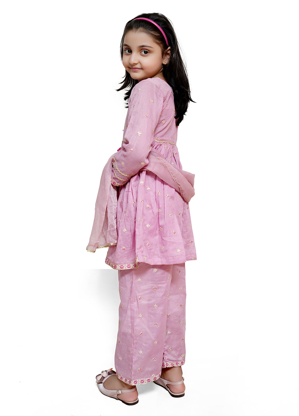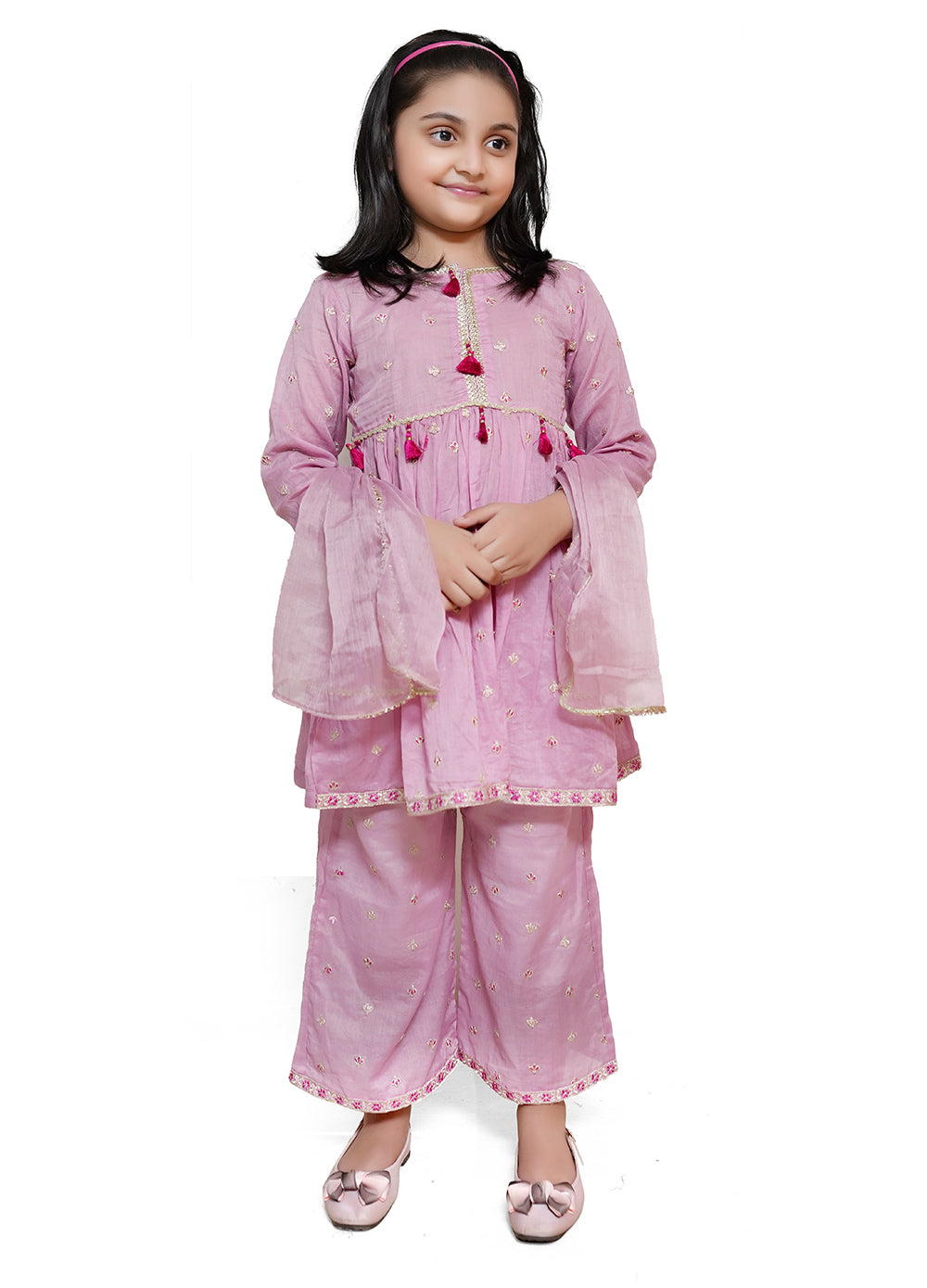 This adorable 3-piece party wear dress is all about charm and elegance. Crafted in a soft blush pink shade with delicate gold thread embroidery, it features a frock-style kurti with dainty tassel details, wide-leg trousers, and a matching dupatta. Perfect for weddings, Eid, and festive celebrations, this outfit will make her feel like the star of the day.